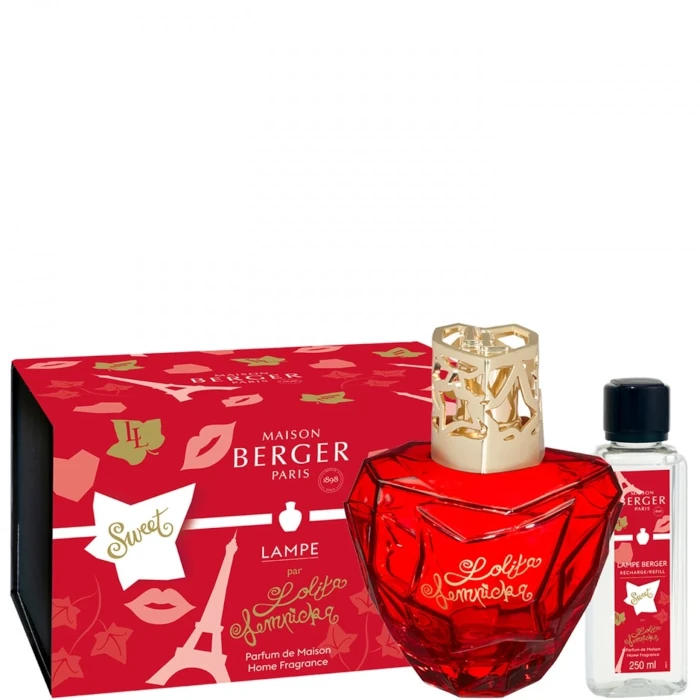 Coffret Lampe Berger Sweet Lolita Lempicka, Le Coffret lampe Berger Lolita Lempicka Sweet s’illustre par son flacon iconique, réplique fidèle du parfum corporel, modernisé par une teinte rouge intense et orné de feuilles de lierre délicatement gravées dans le verre. Ce design, signé Lolita Lempicka, fait de cette lampe un véritable bijou de décoration, symbole de la collaboration entre la créatrice et Maison Berger Paris.