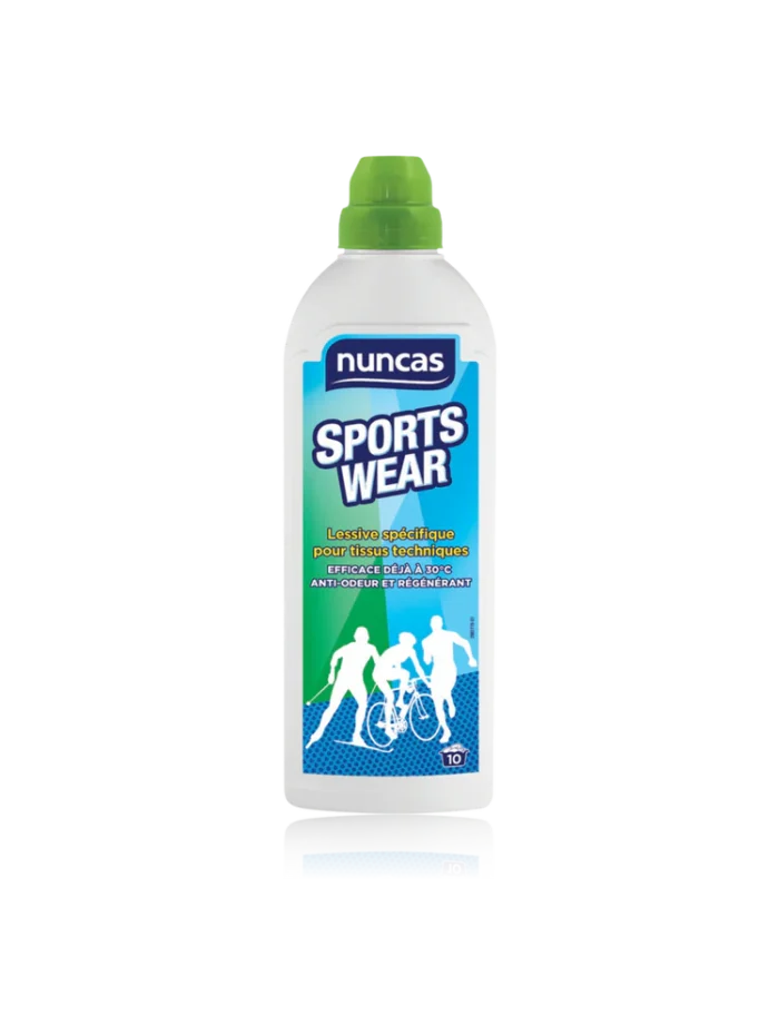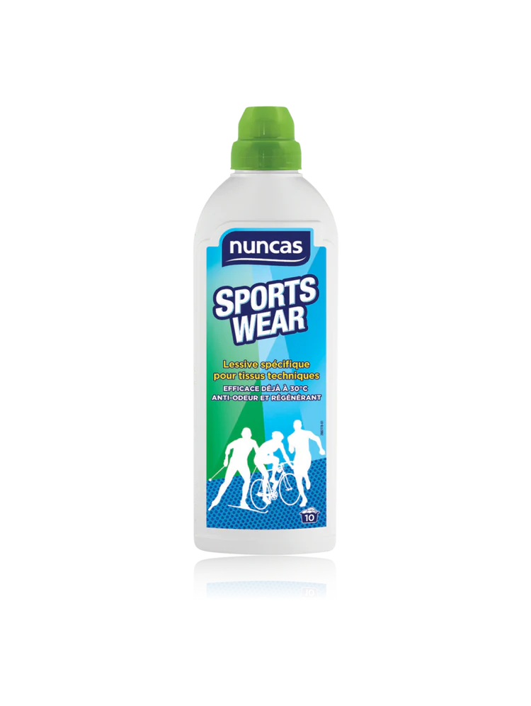 Sportswear – Détergent Spécifique pour Tissus Techniques est une lessive spécifique de Nuncas étudiée pour laver et régénérer les vêtements et accessoires de sport en fibres synthétiques et innovantes. Les tenues de ski, jogging, voile, fitness, cyclisme et autres sont propres et assainies en profondeur grâce à sa forme spéciale, active sur les taches et la saleté caractéristique du sport même à basses températures.